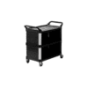 Su construcción de polietileno de alta densidad facilita la limpieza y reduce los ruidos. Durable y atractivo para múltiples aplicaciones. Posee postes de aluminio y estantes moldeados. No se abolla, oxida ni descascara. Sus ruedas articuladas de 10,2cm de diámetro no marcan el piso, reduciendo así los retoques de limpieza. Sus amplias repisas tienen espacio para diversos suministros y equipos. Las prácticas manijas y su tamaño compacto mejoran la maniobrabilidad. Cada repisa soporta hasta 45,4kgs.