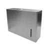 Dispenser para toallas intercaladas de PVC tradicional. Capacidad para dos paquetes de 250 toallas cada uno. Ideal para ser utilizado en áreas de consumo medio a bajo. Fácil de cargar. Posee cerradura anti-robo.
