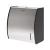 Dispenser para toallas intercaladas de acero inoxidable. Diseño compacto y elegante. Capacidad para dos paquetes de 250 toallas cada uno. Ideal para ser utilizado en áreas de consumo medio a bajo. Fácil de cargar. Posee cerradura anti-robo.